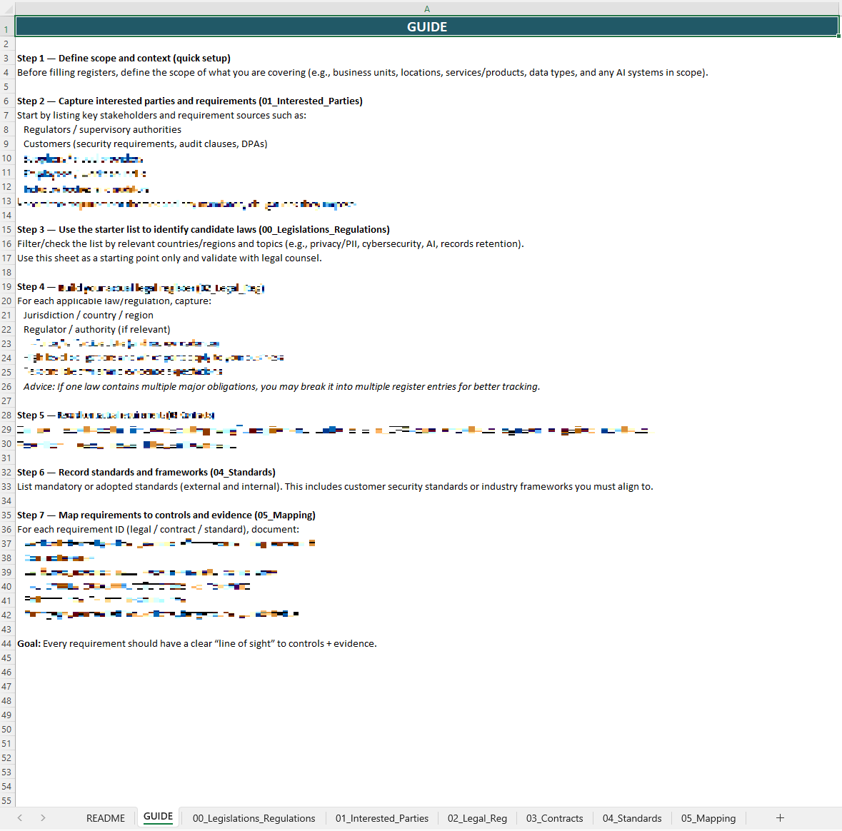 - Populate your Legal Register (only what applies to your scope) and add Contractual + Standards requirements.