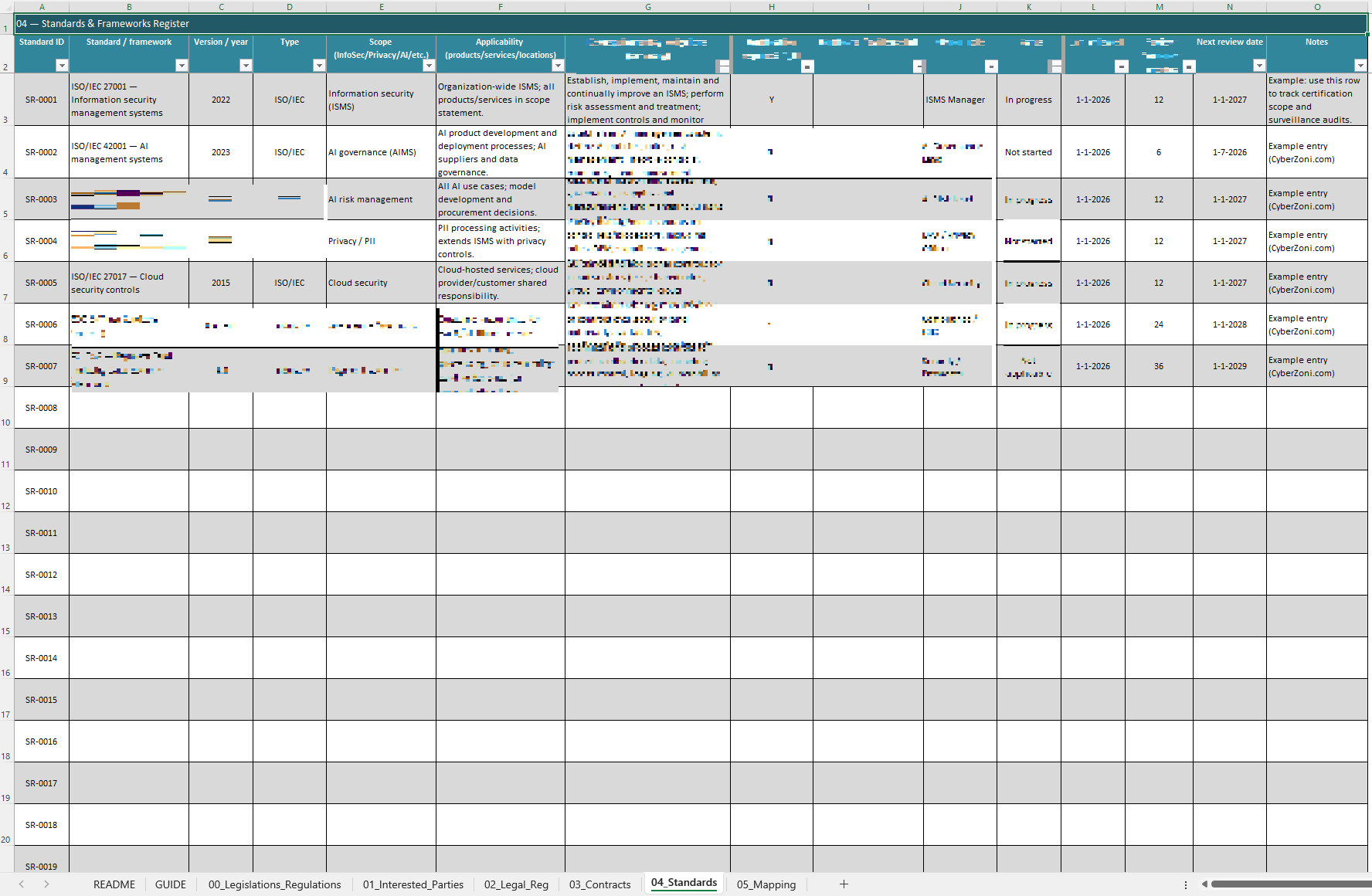 It works as an iso 27001 legal register template and an iso 42001 legal register template—with structured registers and mapping so you can link requirements to controls, evidence, owners, review cadence, and improvement actions.