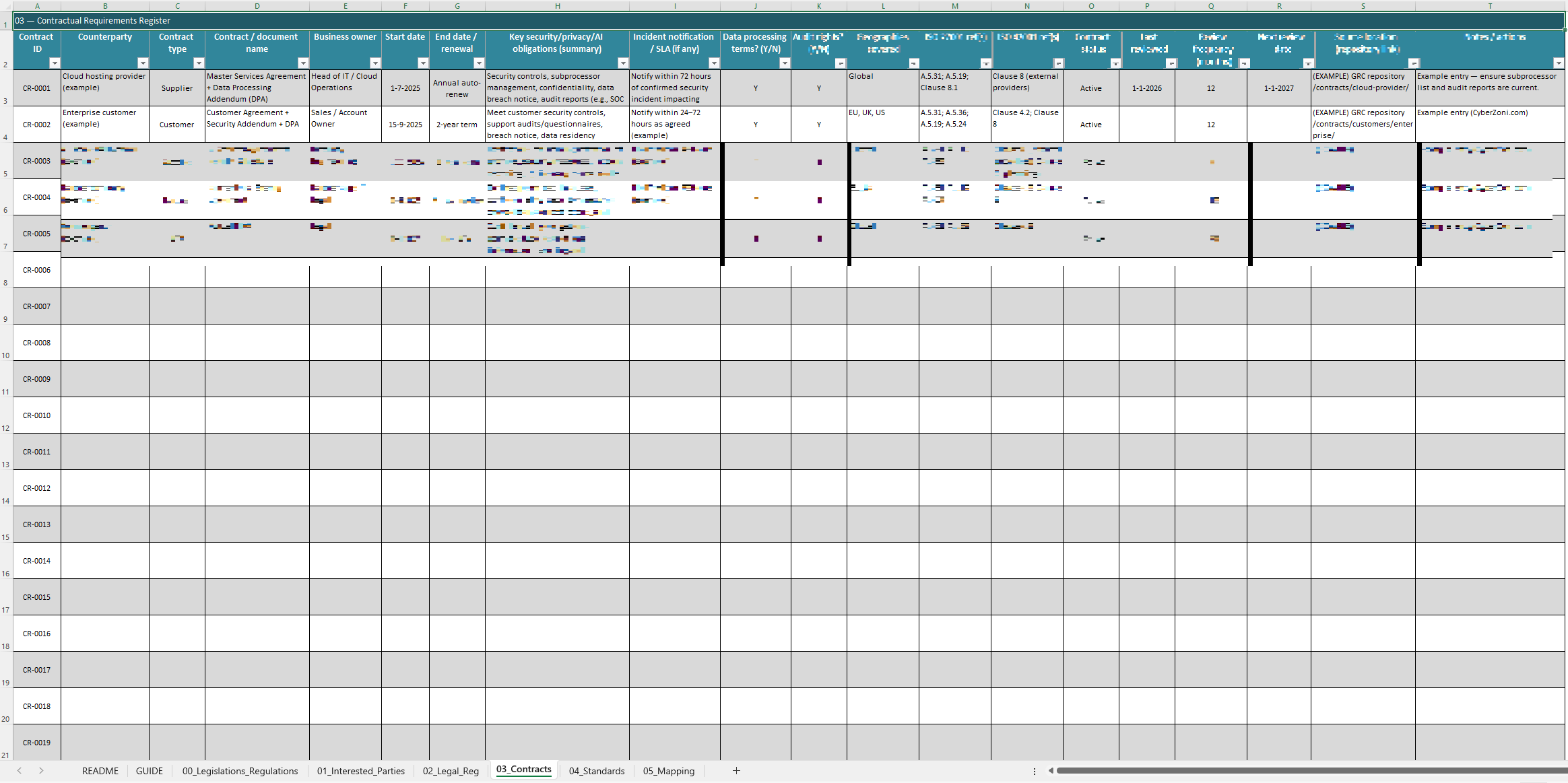 Yes. The workbook includes a dedicated Contracts register and mapping so contractual clauses can be linked to internal controls and evidence.