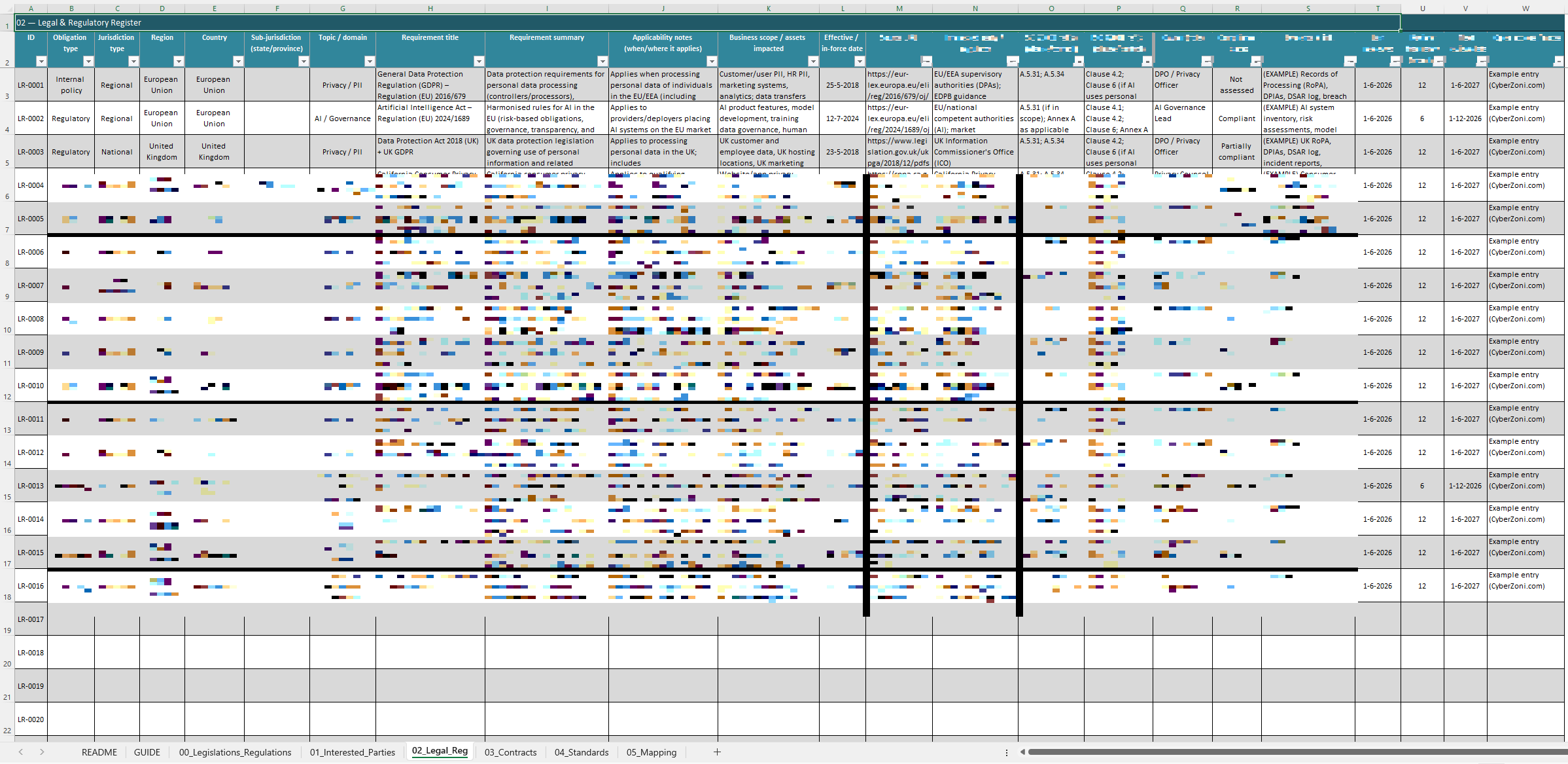 - Legal Register – your organization’s applicable legal/regulatory obligations with ownership, review, and evidence references