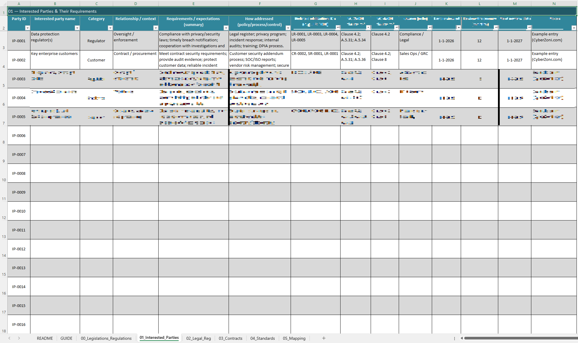 To help you get started faster, the workbook also includes example entries you can adapt—an iso 27001 legal register example approach built as editable rows rather than static text.