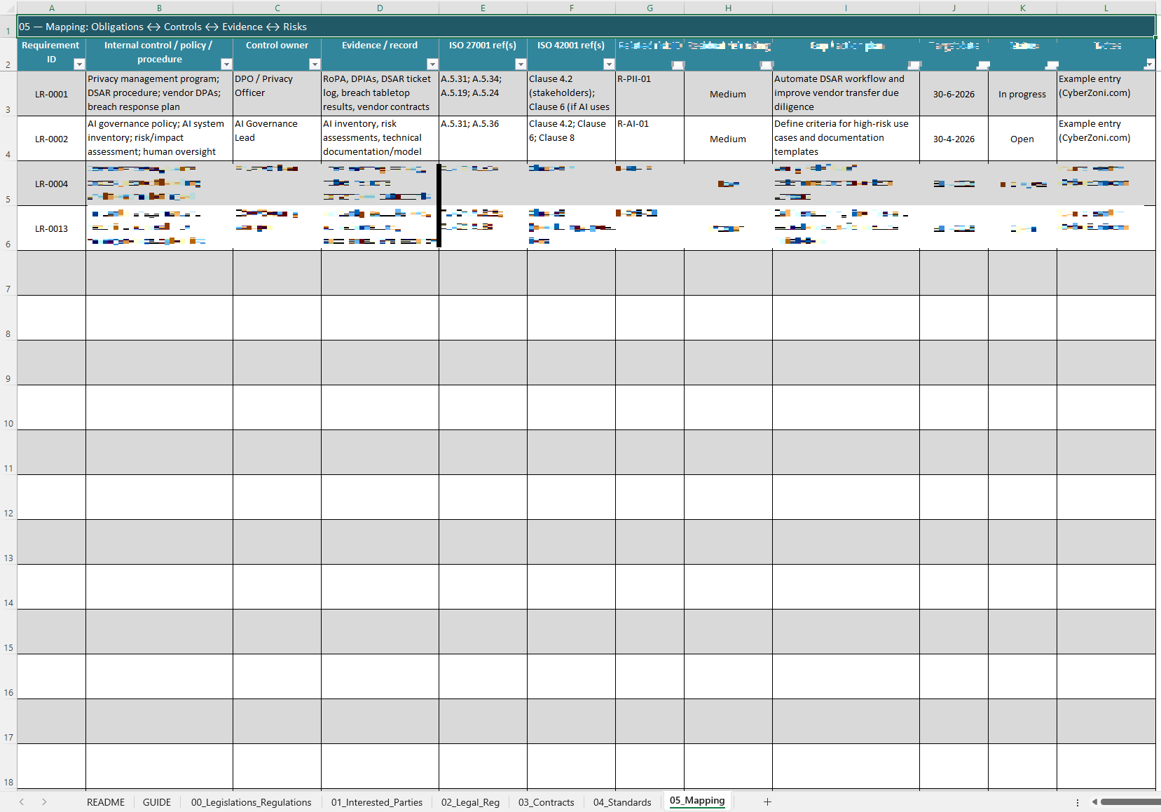 - Complete the Mapping sheet to link each obligation to controls, owners, evidence, and any gaps/actions.