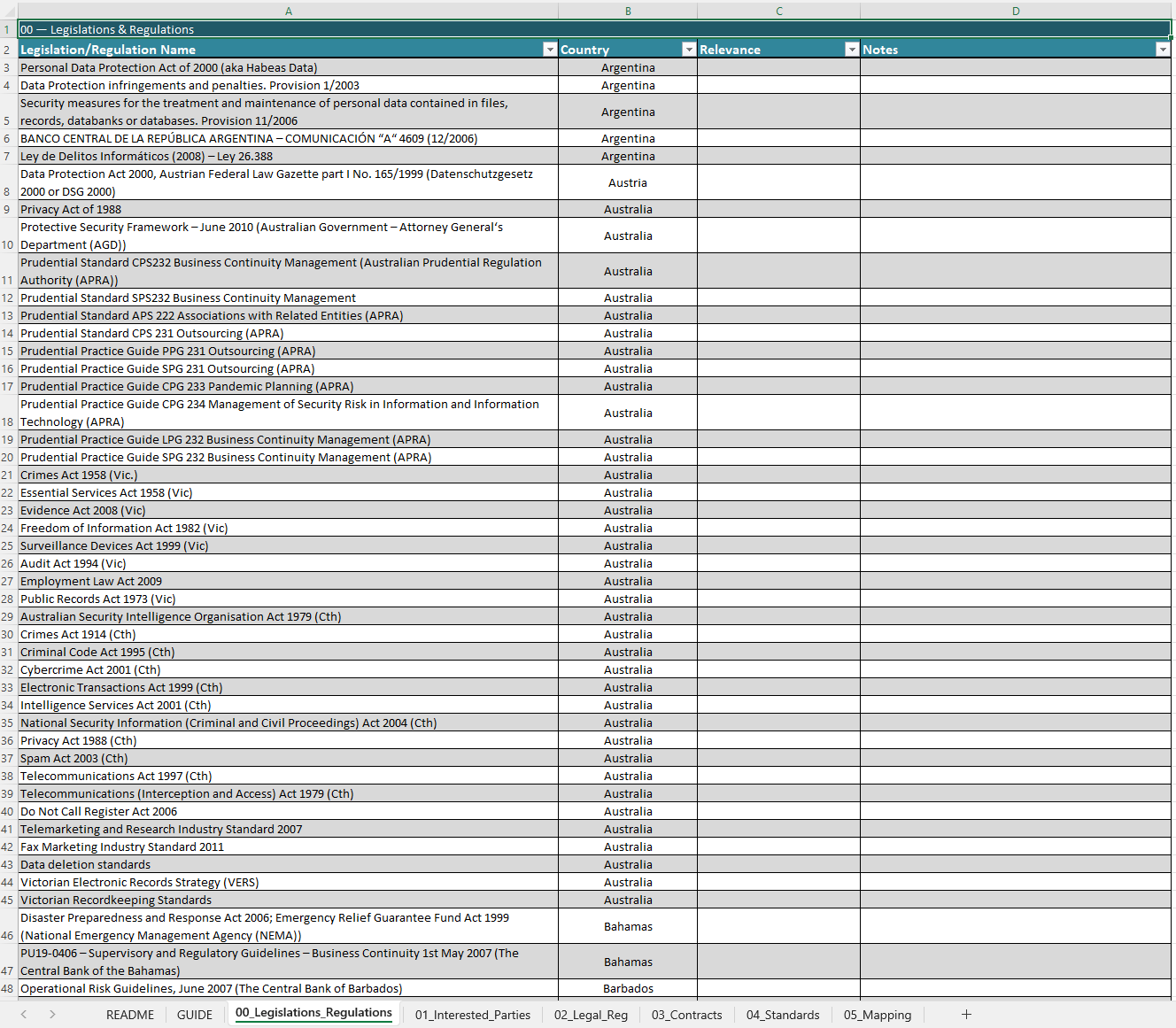 - Use the Legislations & Regulations checklist as a starting reference to identify candidate obligations.