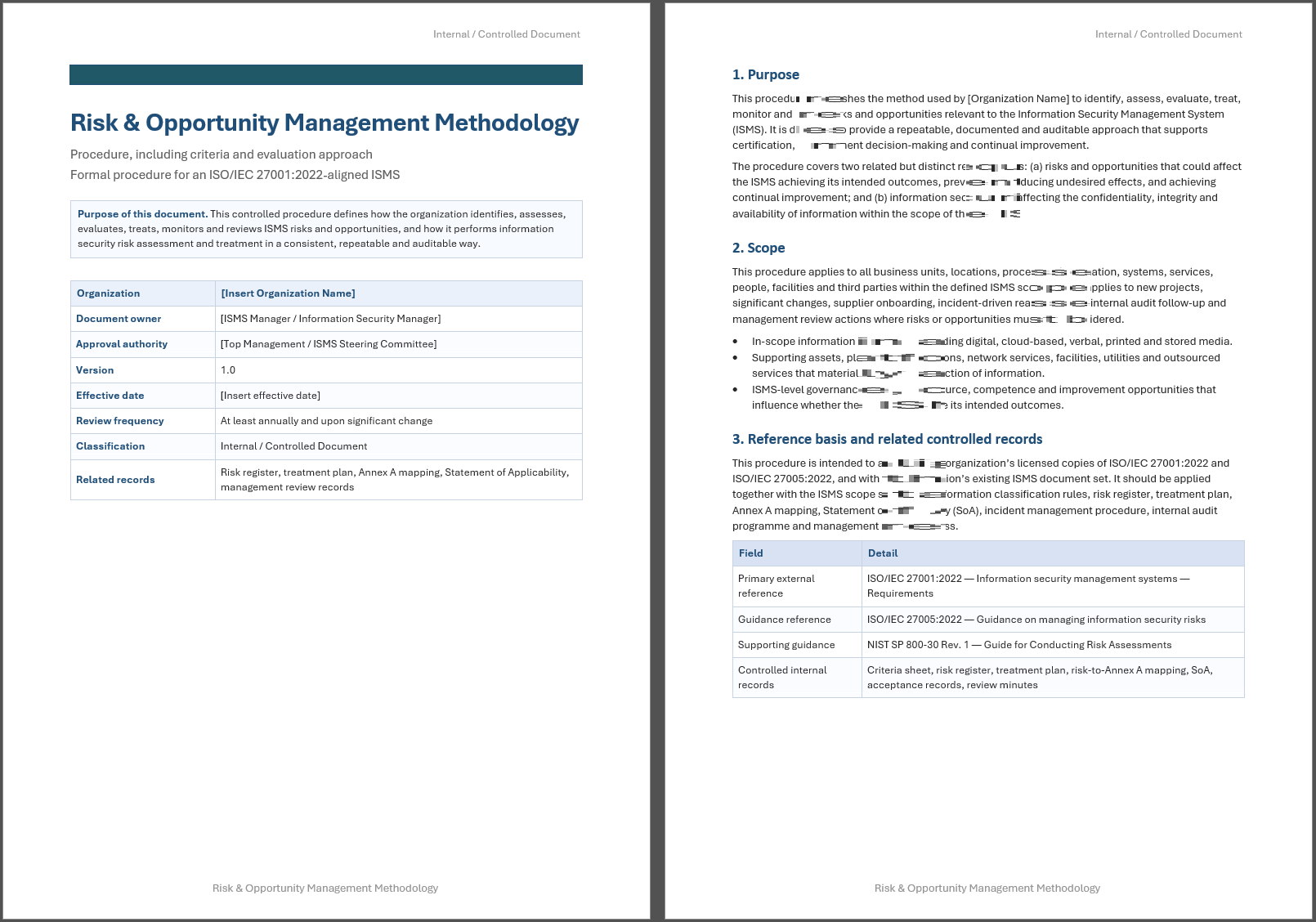 Build a more consistent and defensible risk process with a ready-to-use methodology created to support ISO/IEC 27001:2022. This document helps organizations define how risks and opportunities are identified, assessed, evaluated, treated, accepted, monitored, and reviewed across the Information Security Management System.